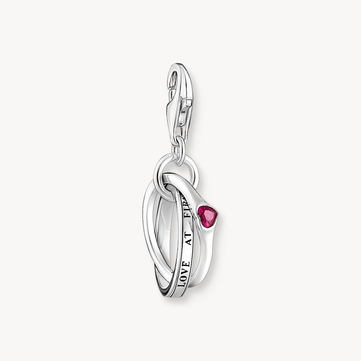 Ringen är ett tecken på den eviga kärleken. Denna tredimensionella charm av återvunnet, lätt svärtat silver har formen av två sammanbundna ringar och symboliserar kärleken som förenar ett par. Den ena ringen är graverad med LOVE AT FIRST SIGHT, den andra är prydd med en röd, hjärtformad sten. Together-ringarnas formgivning återger betydelsen av denna charm på ett utsökt sätt.