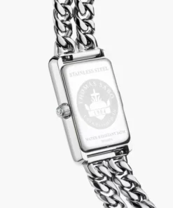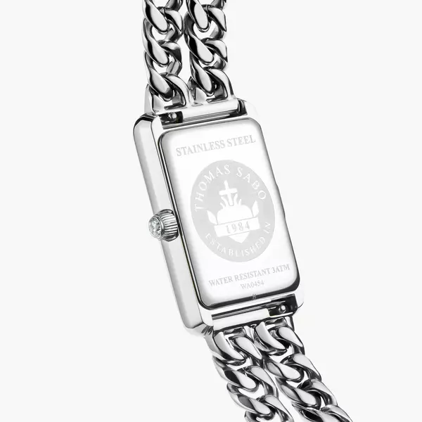 - Smyckesdetaljer: vita zirkoniastenar i baguette- och prinsesslipning, zirkoniasatt krona, silverfärgade visare