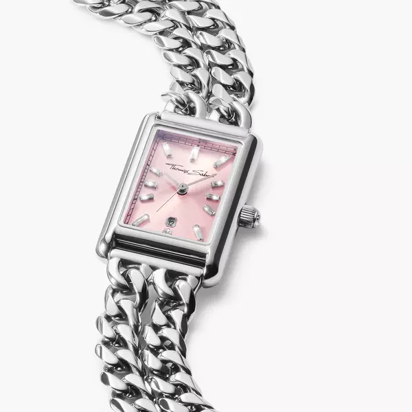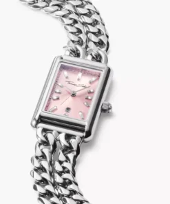 - Damklocka Bold Elegance i rektangulär, slimmad design: polerat silverfärgat boett i rostfritt stål och intensivt rosa urtavla