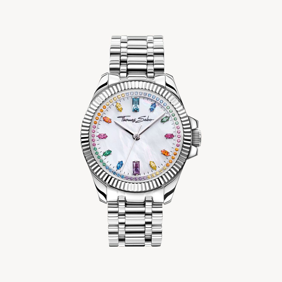 - Klassisk silverfärgad design med ring i räfflad look och urtavla av vit pärlemor med handplacerade stenar i regnbågsfärger som indexmarkeringar