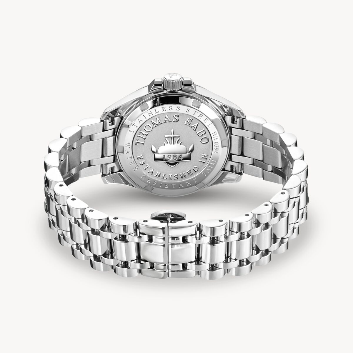 Divine Rainbow: Damklockan kombinerar elegant design med fasetterade stenar i regnbågens färger. Både armbandet och den runda boetten har en klassisk silverfärg och består av rostfritt stål. Ringen i räfflad look och den skimrande urtavlan av vit pärlemor med silverfärgade visare betonar klockans eleganta karaktär. Handplacerade stenar som indexmarkeringar och längs urtavlans kant i regnbågsfärgerna gult, orange, violett, grönt, rosa och blått bryter av stilen på ett spännande sätt. Klockan Divine Rainbow från THOMAS SABO är en perfekt vardagsklocka som utstrålar livsglädje. Den plockar skickligt upp och kompletterar färgerna från de olika Rainbow-kollektionerna från THOMAS SABO. Armbandet i rostfritt stål har ett viklås för enkel på- och avtagning.
