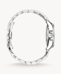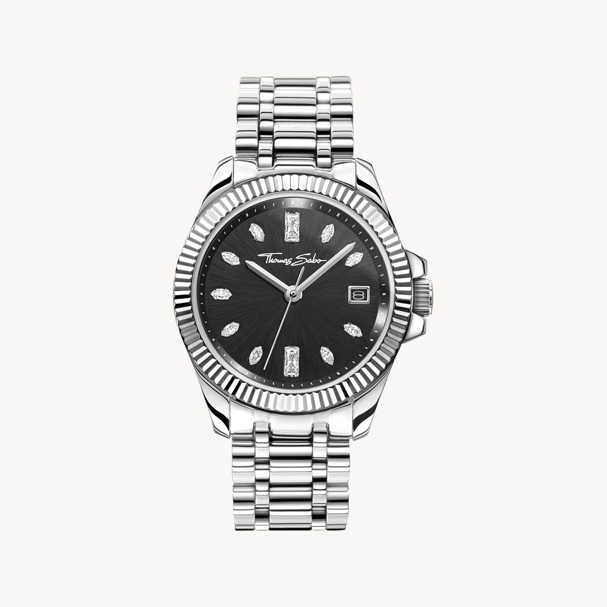 Kombinationen av elegans och fasettslipade stenar resulterar i klockan Divine Silver från THOMAS SABO. Armbandet i rostfritt stål och den runda boetten har en klassisk silverfärg. Den räfflade boetten och den mystiska urtavlan i svart med silverfärgade visare understryker klockans eleganta karaktär. Handinfattade navette- och baguetteslipade stenar som index (vid 12h och 6h) ger klockan en modern touch. Dessutom är kronan för inställning av tid och datum utsmyckad med en TS-logotyp som en liten detalj.
