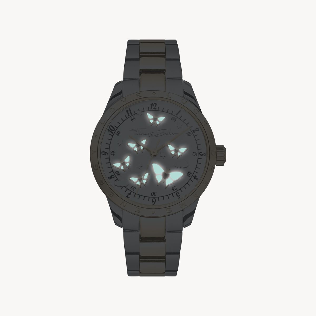 Den eleganta designen på denna klassiska klocka med två visare i två färger imponerar med en lekfull touch. Detta garanteras av flygande fjärilar med svarta zirkoniastenar i form av hjärtan. De skiner med sina guldfärgade accenter på urtavlan – även i mörkret tack vare den självlysande vita emaljen. Små moln och stjärnor avrundar den lekfulla, naturinspirerade designen. På boetten finns graverat LOVE – LUCK – DREAMS – ENERGY.