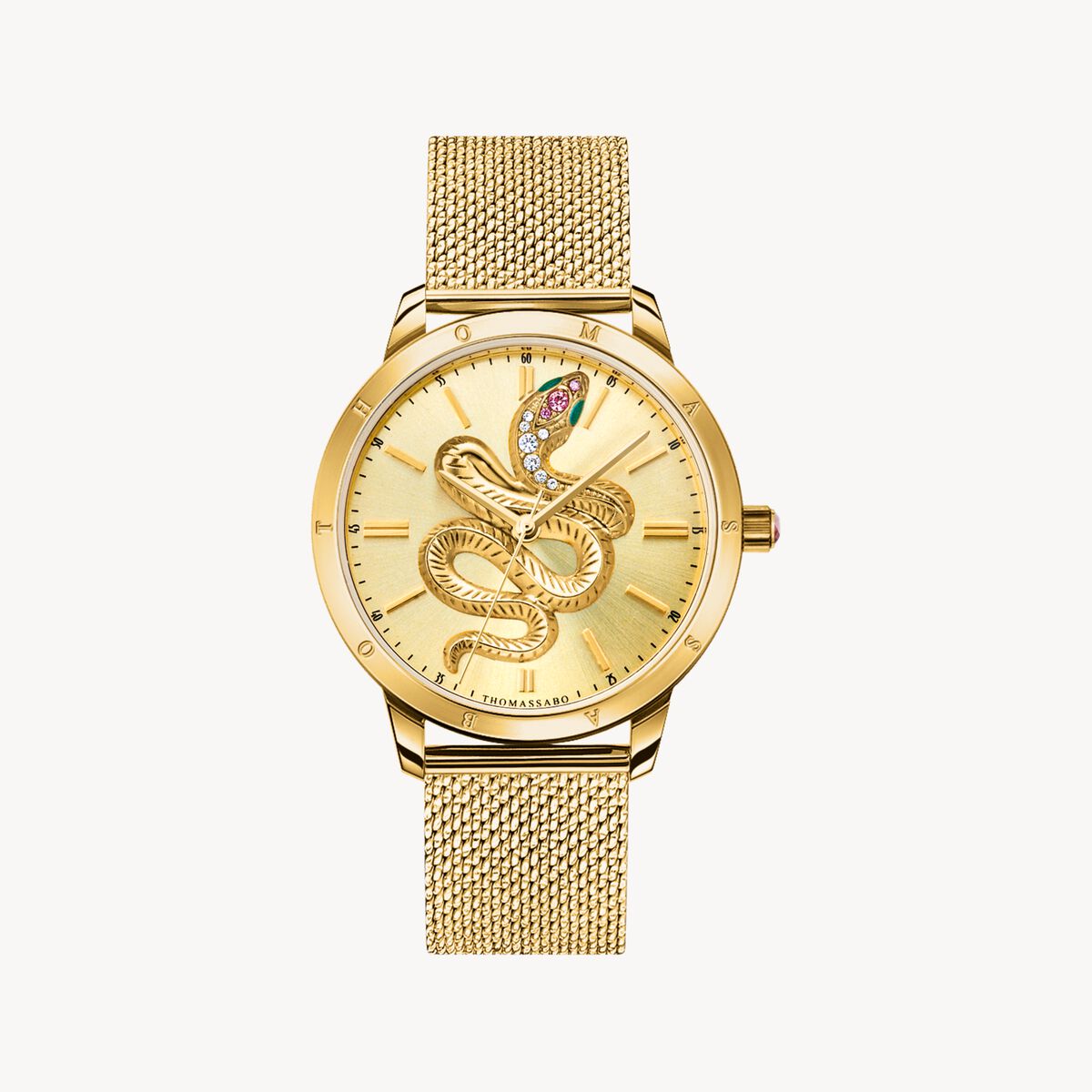 - Strålande, guldfärgad urtavla med orm i 3D med färggranna smyckesstenar och vita zirkoniastenar
