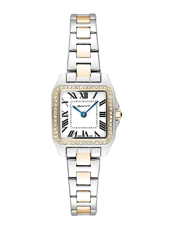 Gant Seneca är en damklocka som förenar tidlös klass med feminin elegans. Den vita urtavlan pryds av romerska siffror som ger ett klassiskt uttryck, medan den fyrkantiga boetten i silver skapar en modern och stilfull kontrast.