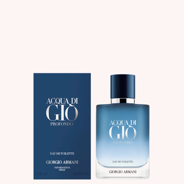 Giorgio Armani presenterar ACQUA DI GIÒ PROFONDO EAU DE TOILETTE, en doft med en ny frisk intensitet som fångar spänningen i att dyka ner i havets svalka. – En krispig och sprudlande maskulin doft som fångar essensen av en man som upptäcker sitt sanna jag. En friskare tolkning av en bästsäljare från Giorgio Armani. Upptäck havets djup med ACQUA DI GIÒ PROFONDO, där den magnetiska dragningskraften hos marina noter avslöjar en frisk maskulin doft som reflekterar djup självupptäckt. – ACQUA DI GIÒ PROFONDO EAU DE TOILETTE inbjuder dig att dyka ner i svalkan hos det böljande havet – en kontrast av sprudlande kryddor och frisk grapefrukt, energirik tack vare cypressens krispighet och lavendelns örtiga djup. – Detta dopp i havet börjar med citronessensens skärpa, som utvecklas till en sprudlande blandning av friska kryddor. – Havets djup framträder i doftens hjärta, där cypressessens, med sina kryddiga, kådiga och kamferartade noter, flätas samman med den örtiga, aromatiska lavendeldoften. – För att framkalla havets djärva styrka ger patchouli från Guatemala en träig jordighet till doften, som smälter samman med den salta sensualiteten hos en träig mineralackord och frammanar elementens rena kraft. – Som en symbol för ACQUA DI GIÒ PROFONDO EAU DE TOILETTES uppfriskande dragningskraft är den ikoniska ACQUA DI GIÒ-flaskan klädd i graderade, frostade blå toner, som en nick till de nyanserade färgerna i de djupaste haven. Silverfärgad text ger en krispig kontrast, medan den tyngda glasbotten ger en gedigen känsla till den karakteristiska rundat fyrkantiga silhuetten.