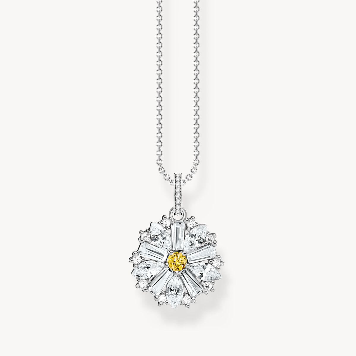 Bär det här speciella halsbandet och låt det bjuda in dig att drömma. Hängsmycket är inspirerat av skira prästkragar och infattat med gula och vita baguette-, marquise- och rundskurna zirkoniastenar. Den lekfulla designen hyllar naturens skönhet och är tillverkad på ett hållbart sätt med stor omsorg. Halsbandet och hängsmycket är tillverkade av återvunnet silver. Längden på halsbandet kan justeras till 40, 42,5 och 45 cm.