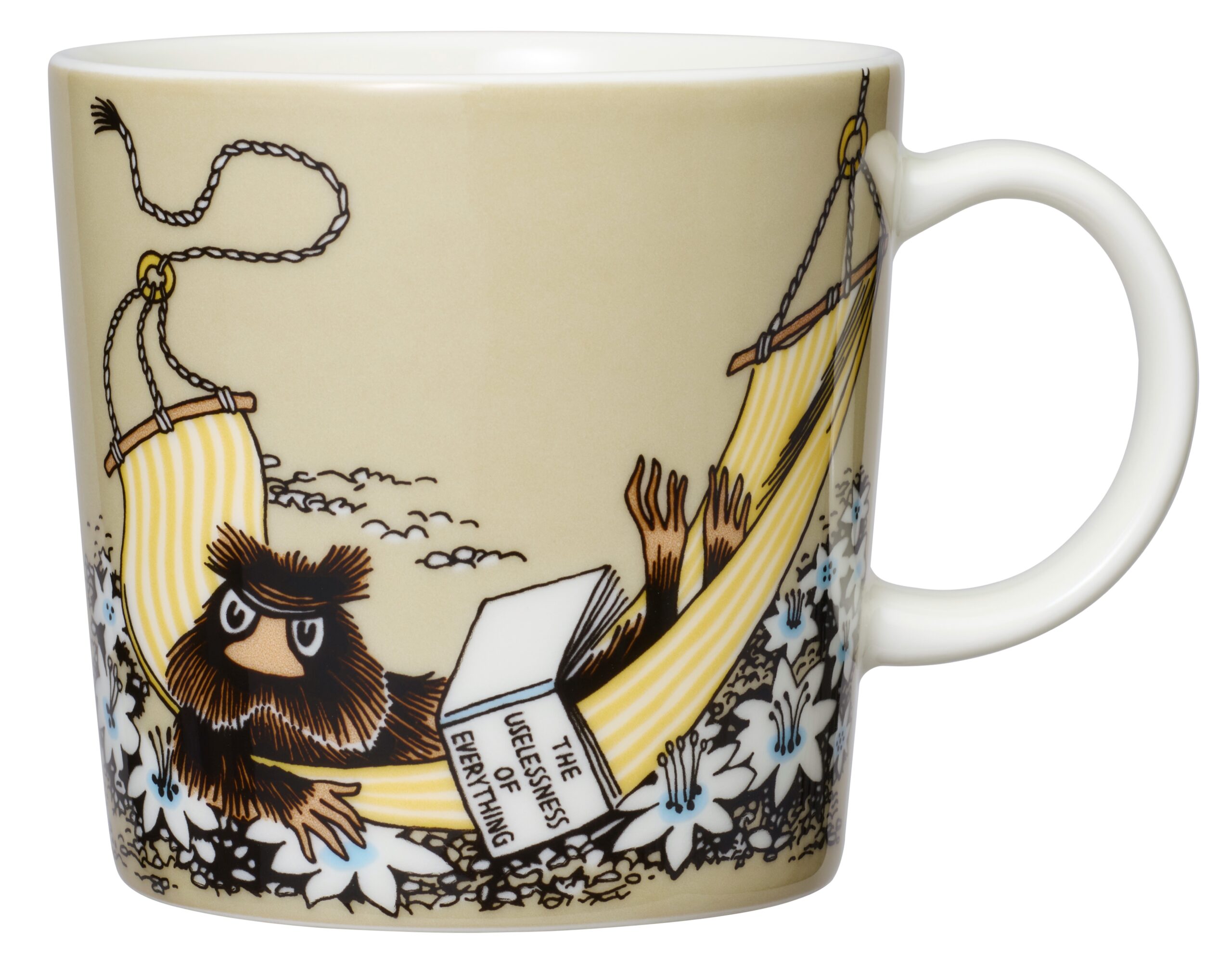 Bisamråttan är en tänkare som läser mörka, filosofiska böcker och gärna delar med sig av sina pessimistiska tankar. Bisamråttan tycker om att ligga i muminfamiljens hängmatta med sin favoritbok. Det värsta han vet är att förlora sin värdighet, vilket tyvärr händer allt som oftast i Muminhuset. Moomin Arabia, mugg 0,3 l, Bisamråttan